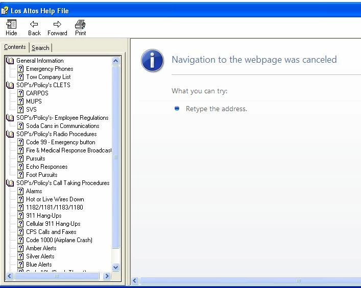 after successfully creating the .chm file. when I go to view it, I get an error message in the view window stating "Navigation to the webpage was canceled" My contents show on the left side of the window.