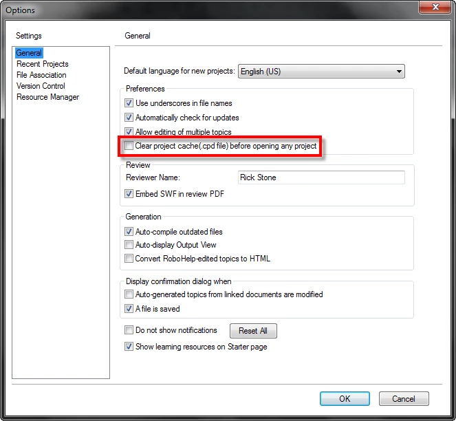 - A third dialog box appears with the message: Your project file, C:\Users\jbruce\Desktop\Publish\eHelp.cpd, is corrupt and connot be opened. Try Deleting this file and reopening the project. I delete the .cpd file and click OK.