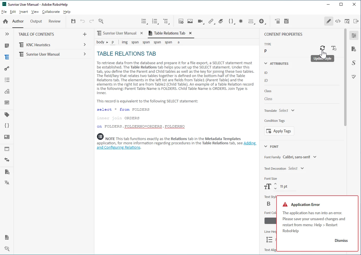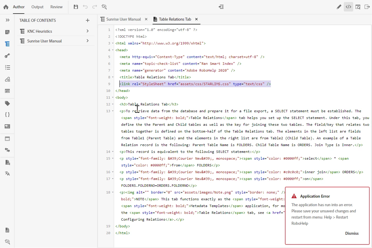 - Opened different topics. All triggered Application Error: The application has run into an error. Please save your unsaved changes and restart from menu: Help > Restart RoboHelp.