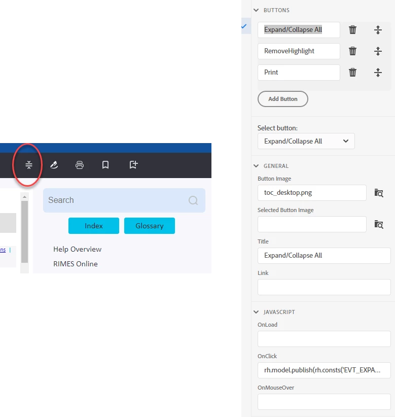In RH's Skin-Layout tab is ‘Custom Buttons’. They show the first custom button as Expand/Collapse with a script is in place in the OnClick field; yet in my output nothing happens when you click this button. The only other open field on the tab is ‘Link’; do I need to fill in that field to get the button to work or is there some step I am missing? Is this a known bug they are working on? I did Help-Update and it said my progam was fully up to date. Image attached.