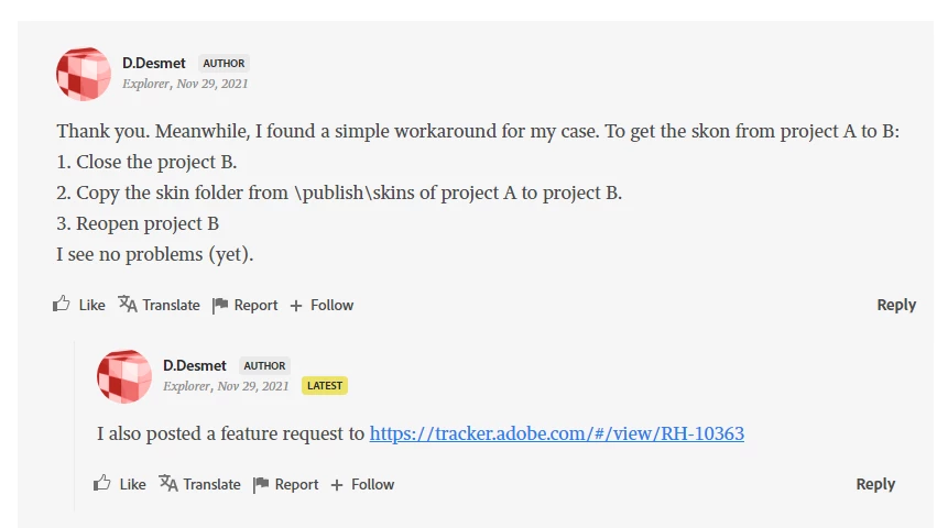 I request help please, my design partner EXPORT the New Frameless skin on her computer with Robohelp 2020.8.34.