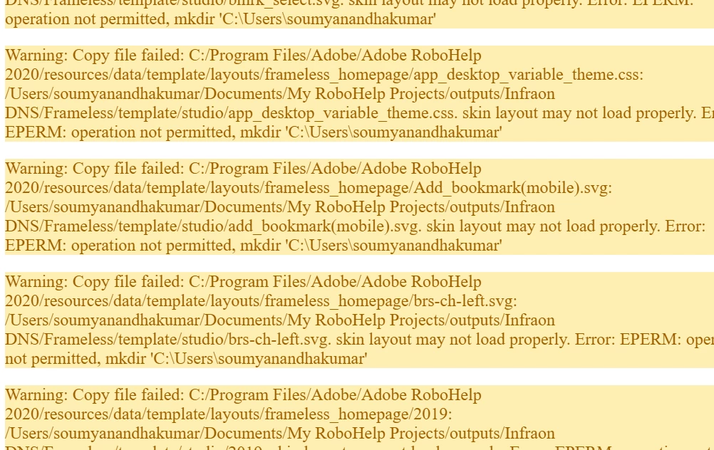 I am using the Robohelp 2020.8.34. When I sent for frameless generate. It failed. I checked to log files. It shows errors to load the skin layout. Do you know how to fix this? See the image I have got errors.