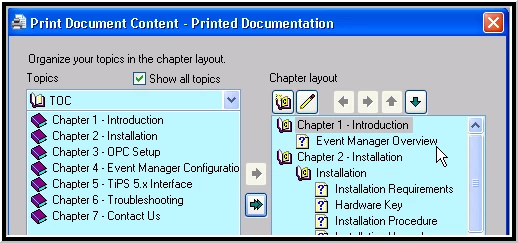 For grins and giggles I generated the documentation with ONLY Chapter 1 selected to see what would happen; it shows up in the TOC just fine: