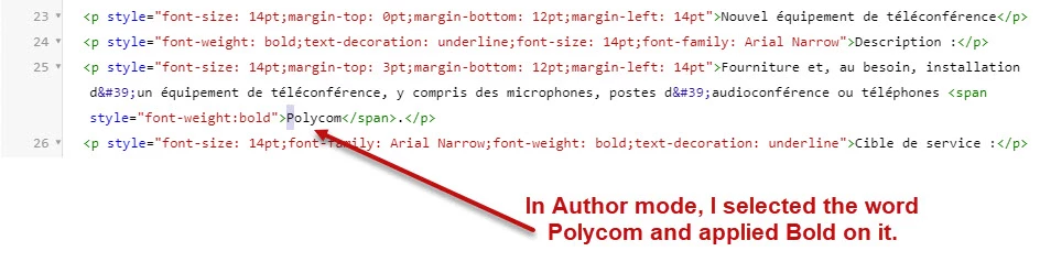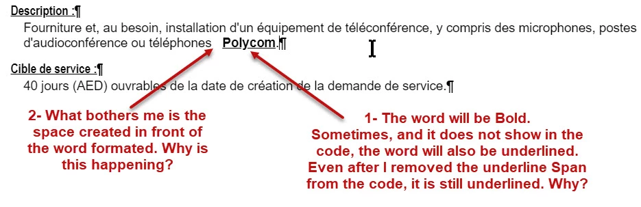 This time, I selected a word in a paragraph (Polycom). I applied the Bold format by clicking the "B" button. The word was formatted, but a space was added at the left of the word. This space can't be selected. Also, by clicking the "Bold" icon, an underline appeared under the word. Both formats can't be remove by clicking the "B" or "U" icons. Have the delete the Span codes.