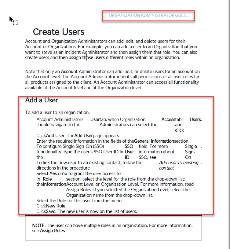 I'm running into a strange issue with the PDF output that's being generated for one of our user guides in RoboHelp 2020. The exact same topic ("Creating Users") is included in two guides: Organization Administrator Guide and Account Administrator Guide. In sections where there are numbered lists, the formatting in the Organization Admin Guide breaks, but looks fine in the Account Admin guide.