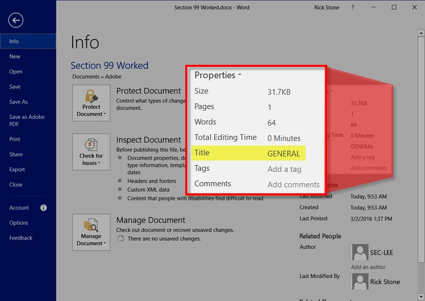 If you open the document in Microsoft Word and click the File tab and look at the Info section, you note there are attributes (Properties) that are assigned to the document itself. One of the Properties is named "Title". And as you can see in the image below, this field presently contains the word "General".