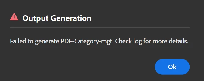 However, when I try to gen PDF output, it’s not working. I get this message: Failed to generate PDF-Category-mgt [my pdf preset]. Check log for more details.