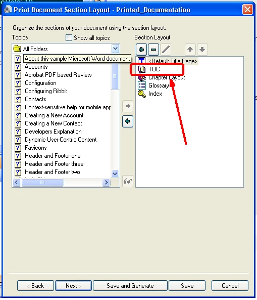 Click on the + icon at the top of the Section Layout section. This will allow you to add the TOC to the list of document sections you produce. Once there, you can move it up or down in the list of sections using the up / down arrows.