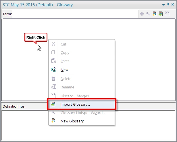 I am using RoboHelp 11. I need to import a glossary file. I find the glossary file in my Project Manager, click file>Import> but there is no Glossary in the options. Any ideas?
