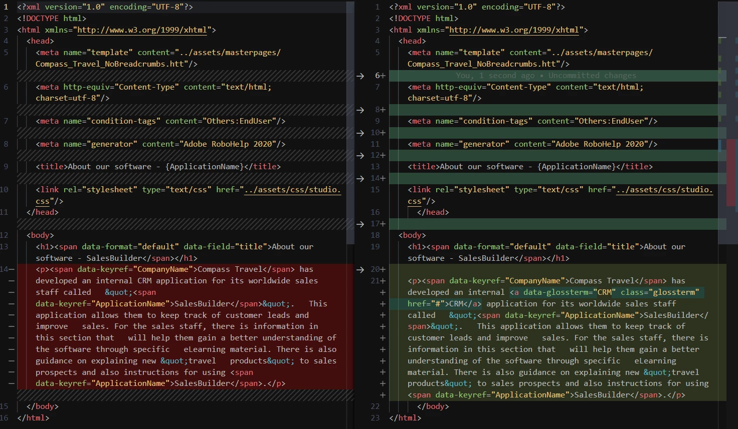 Hello! First post here. I'm having a problem in RH2020 where after running the glossary hotspot tool, blank lines are inserted into any file it touches. I thought maybe it was an issue with my project, so I tried it in the CompassTravel sample project and am getting the same result, as is seen in the screenshot below. I think Friday was the first time I'd ever used the hotspot, so I have no idea if this a brand-new problem or an older one. I've spent several hours troubleshooting, including uninstalling and reinstalling RH and making sure the update is current (2020.8.34). The blank lines are showing up in Visual Studio Code, Visual Studio, and Notepad++, but don't appear in the source view in RH.