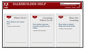 Can anyone direct me to the sample Salesbuilder project that has the home page with the three columns - What's New - elearning Videos To Go - Share the Learning? I cannot find this sample anyhwere and either can Adobe. I have connected support and their tech communication suite team. Thanks for any help.