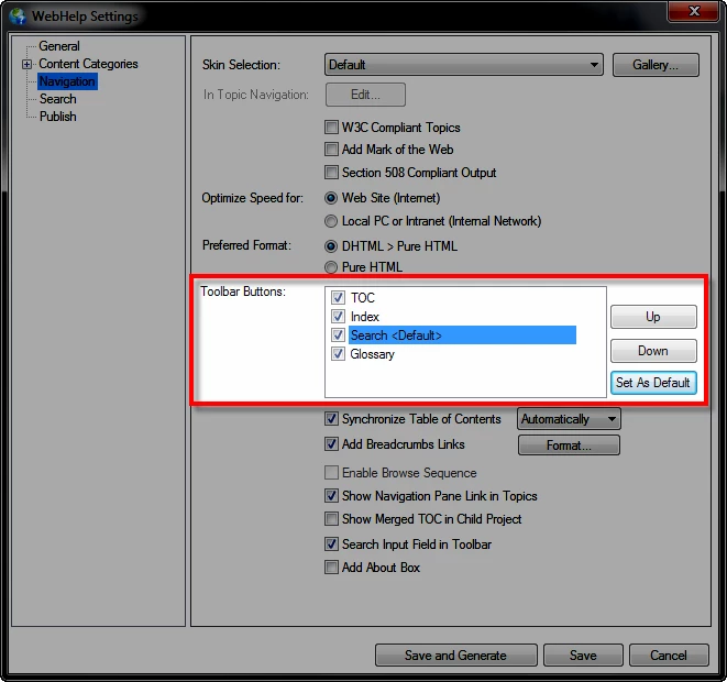 Hi! I am using RoboHelp 10 and generating WebHelp. I am using traditional/no skin, and I am including toolbar buttons for a TOC and Search. My understanding is that the help should display the Contents in the left pane when you open it (I don't have the option to reorder the buttons with no skin), but it is opening to the Search in the left pane instead. I have had my client clear his browser cache, but the file still opens to the Search (see pic below). Any ideas?
