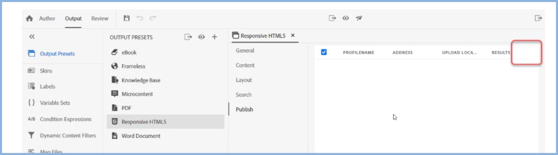 In RH 2020, I am unable to see the Settings gear for publishing to Responsive HTML5. I successfully generated my output, but can't figure out how to publish it. Attaching a screenshot to show what I'm seeing.