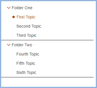 Hi. I am looking for tips on how to add a spacer / line between sections or topics in my toc for frameless output in RH2022. I'm not afraid to get into the code, if that is the solution--I just don't know what the best solution is. I did try adding a horizontal rule in the toc code, but it did nothing. I tried adding an unlinked section with -------------- for the topic title, but it doesn't display at all because the section is empty. I don't want to use a topic because I don't want it interactive. I just want space or a some kind of line between pieces of content in the toc.