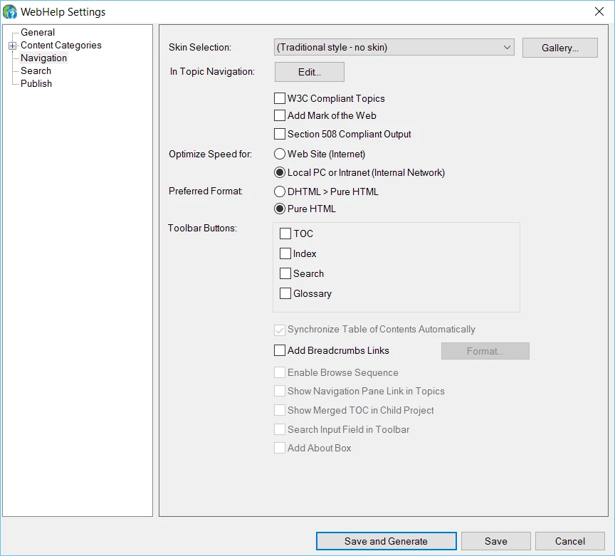 Is there a way to compile Robohelp 2015 without a table of contents showing?