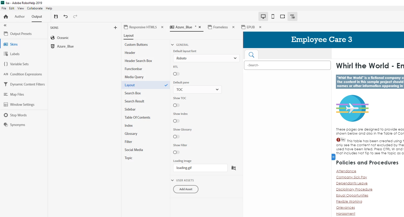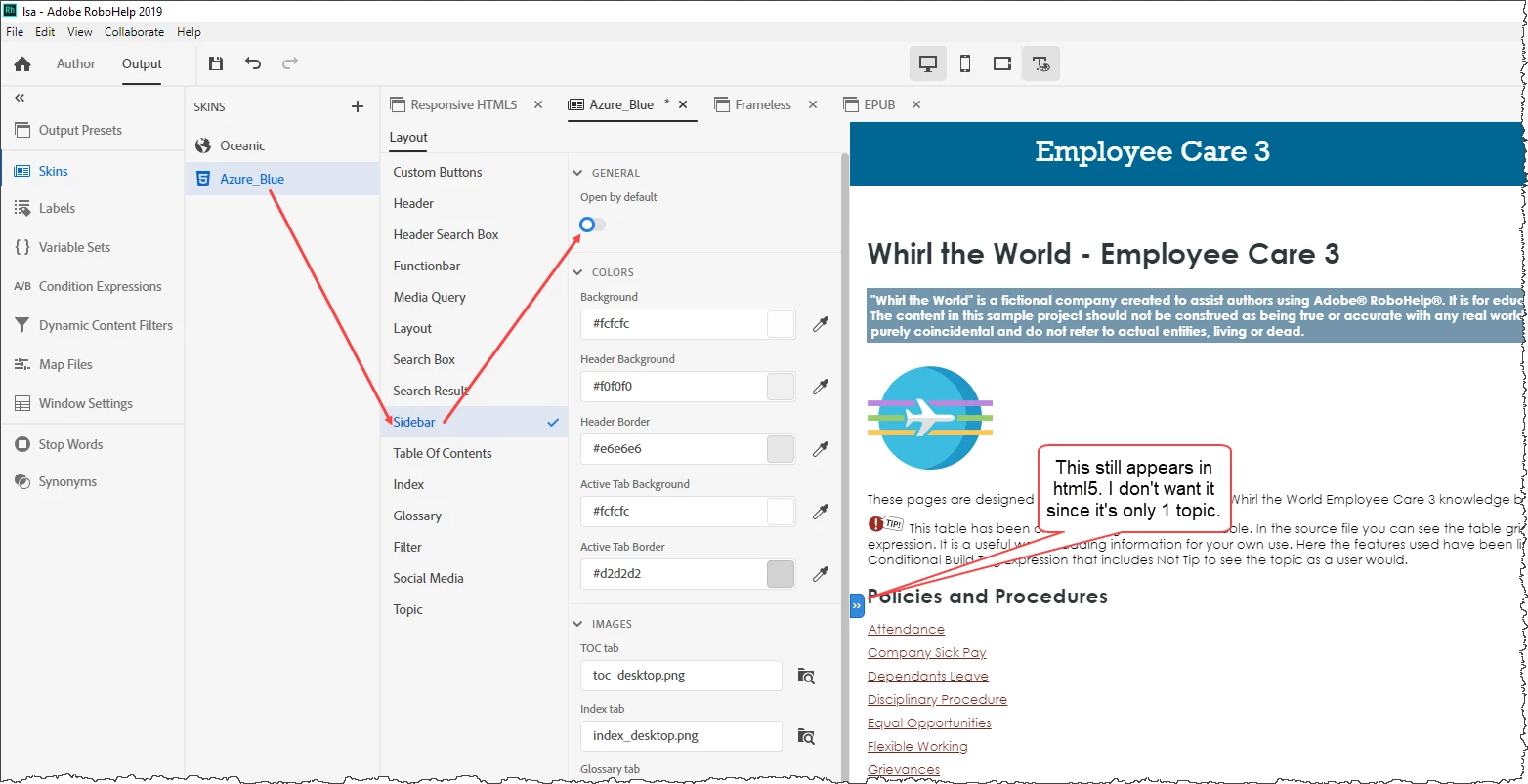 I am so sorry if this is obvious. Using RH 2019, I can't seem to publish to HTML5 with "no TOC". I don't want the TOC at all because I only have 1 topic I want to show. In my Azure Blue skin screenshot below, I don't have the TOC on, but it still publishes the TOC. Please help.