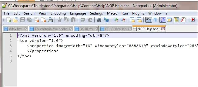 When I open the HHC file with Notepad, I only get the info shown in the following screen. There is nothing in the HHC about the books or the topics in the books. (I thought we used to be able to open the HHC in a text editor and verify the book/topic structure.)