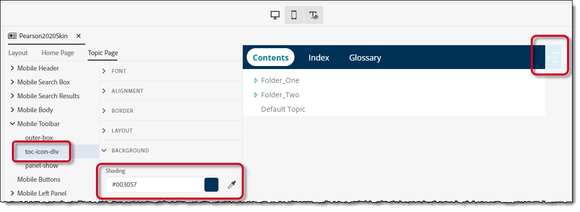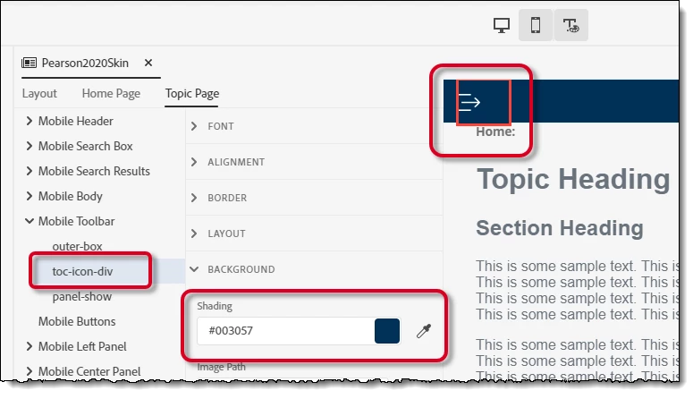 How do I change the color of Hide left Panel for Mobile in New RoboHelp UI?