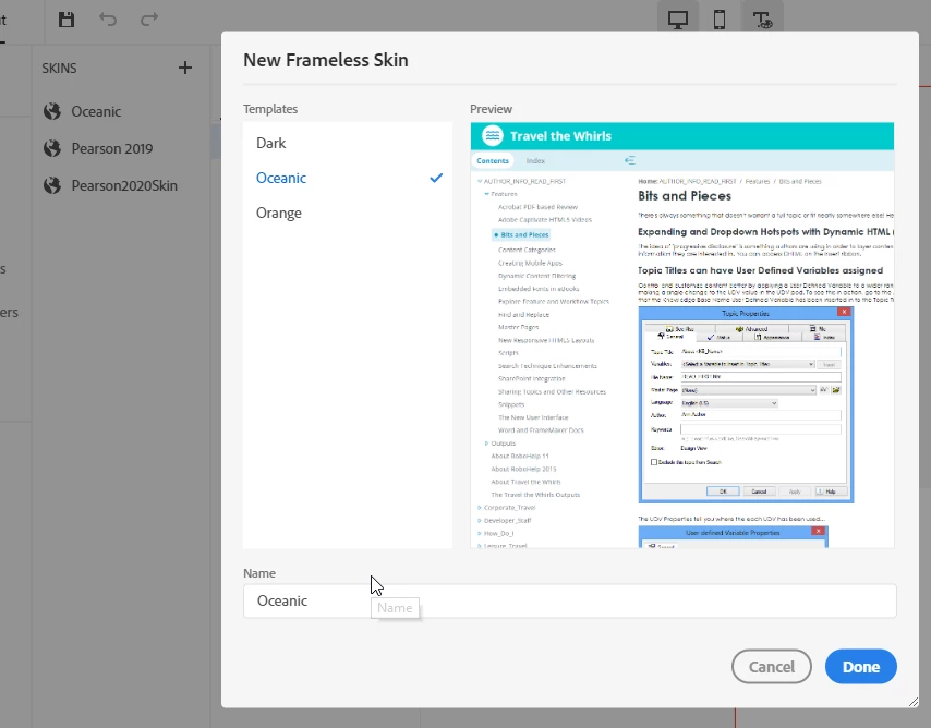 Content removed as there was confusion between the new Oceanic frameless skin that ships with 2019 and the Ocean skin that was deprecated in RoboHelp 2017 Update 2.