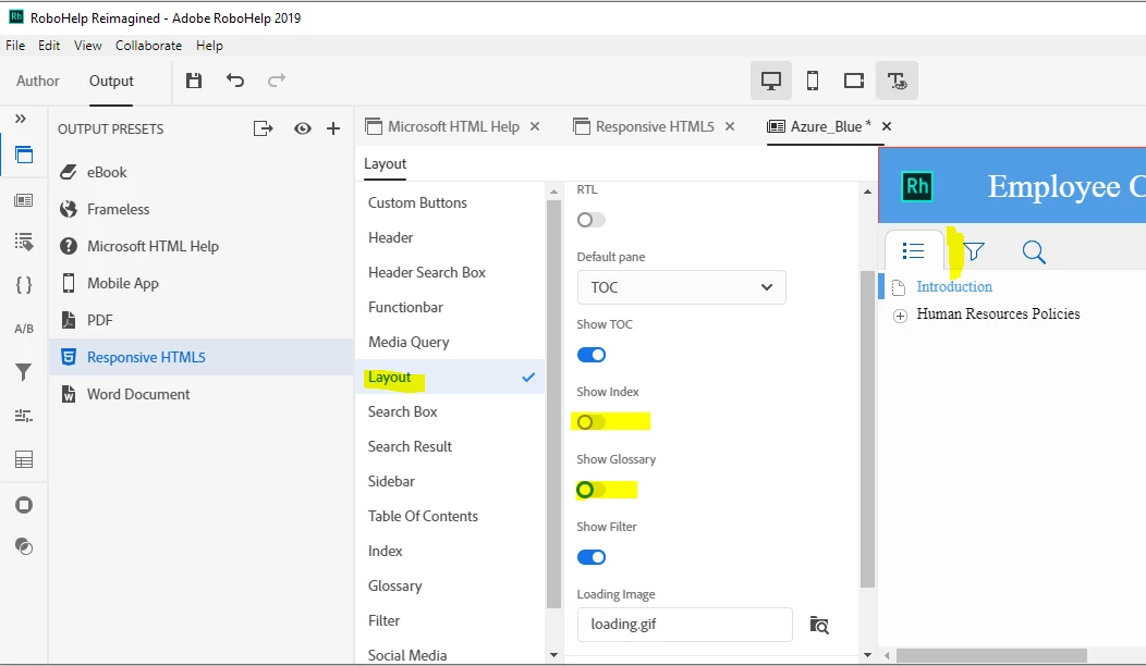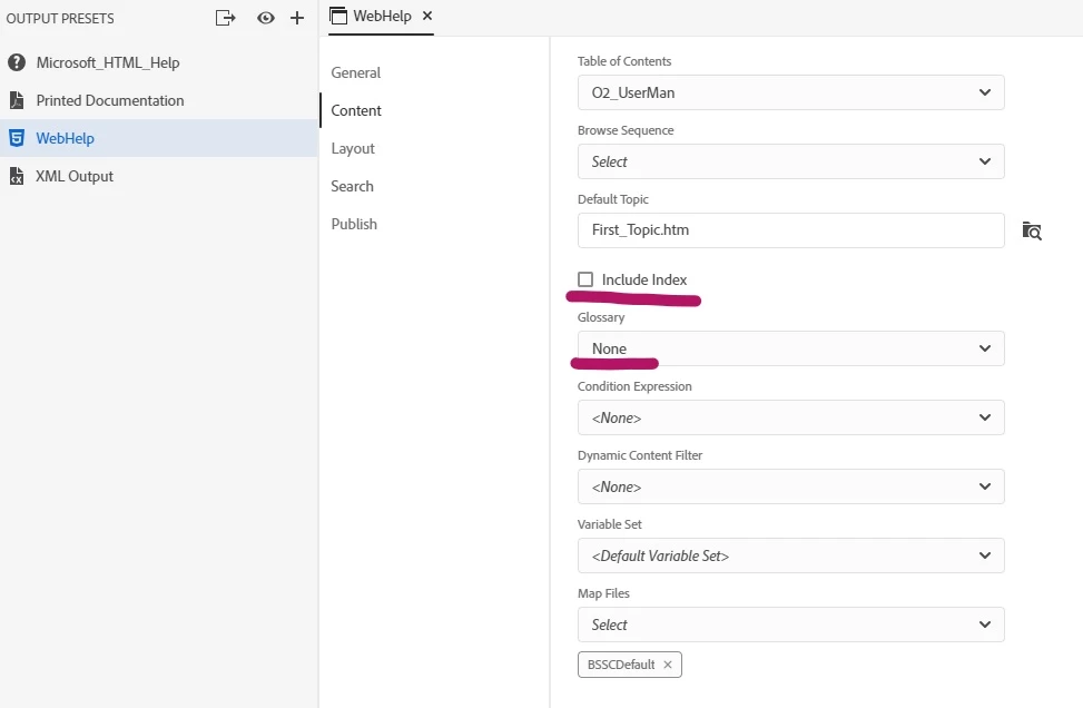 How do I delete Index & Glossary in WebHelp output in Robohelp Reimagined 2019?