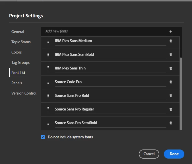 I'm working on a frameless template with a font called Source Sans Pro. I have added it to the fonts in the Project settings. It is set as the font wherever needed. Once I publish my frameless template, for me it is displaying the correct font. However, the fonts are not embedded (or at least not correctly - they can be found in the output folder) - if opened in a browser on a computer without Source Sans Pro installed, the fall-back font Times New Roman is used.