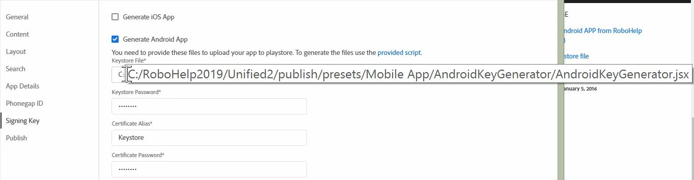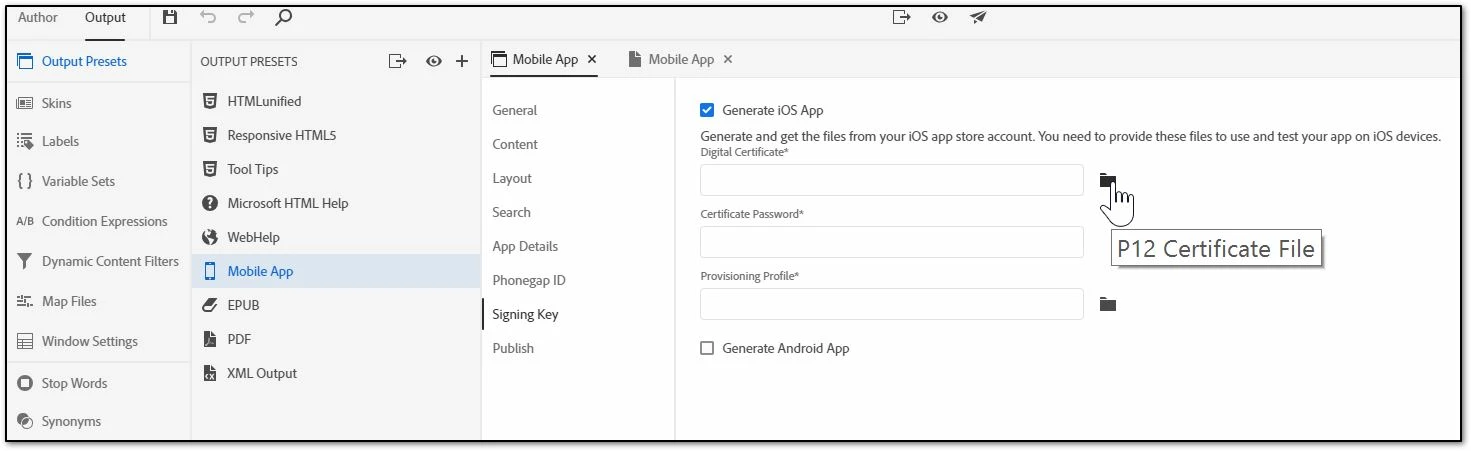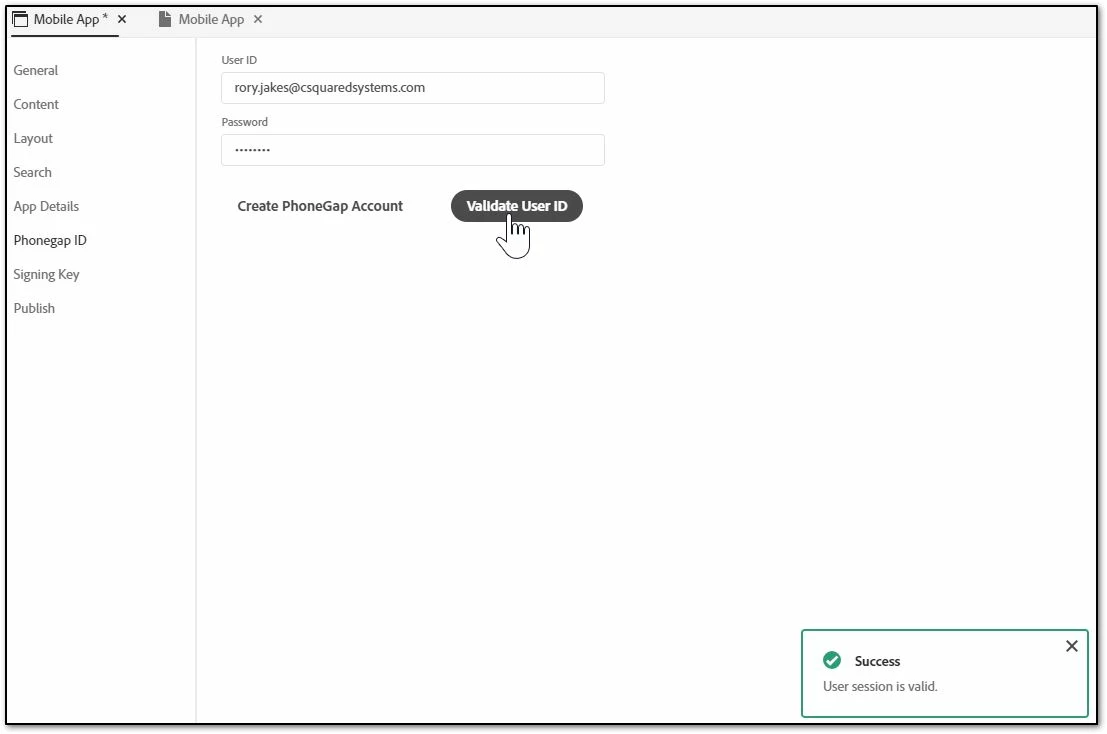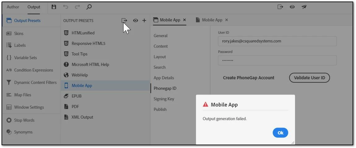 How do I generate a mobile app successfully using the Mobile App output preset in RoboHelp? I am using RoboHelp 2019 ver. 2019.0.5. I have a PhoneGap account set up and am successfully validating user ID (below).