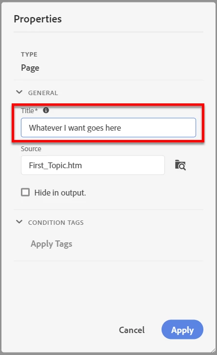 How do I get the actual topic name to change under contents and ToC choices in RoboHelp 2019 new UI?