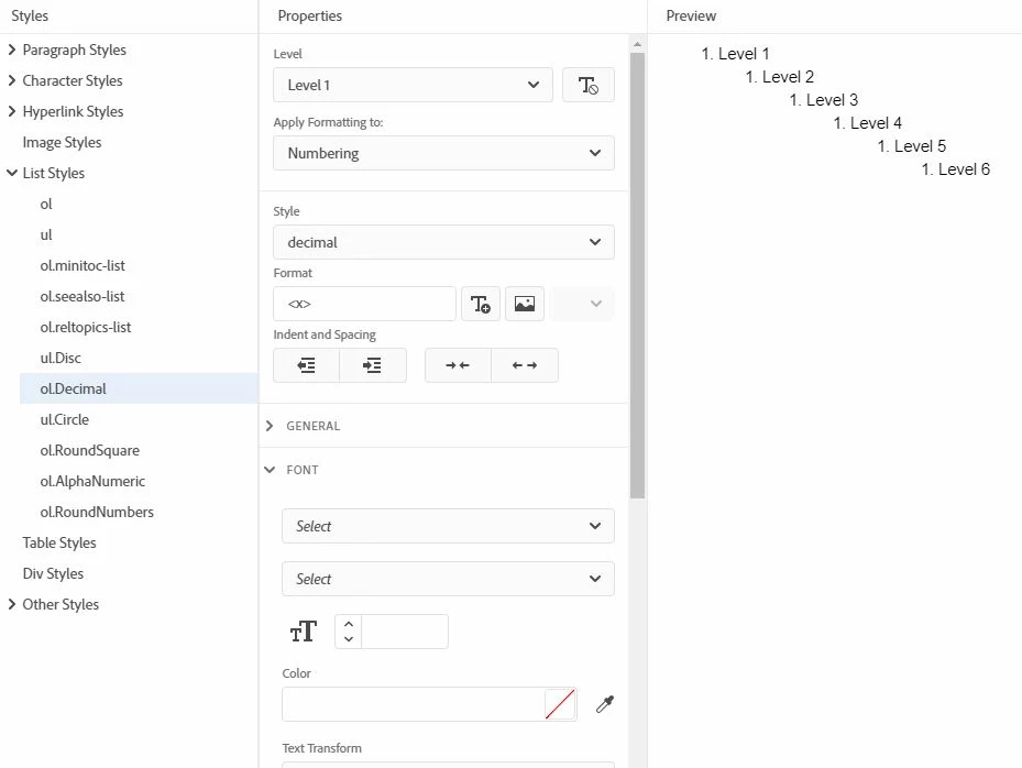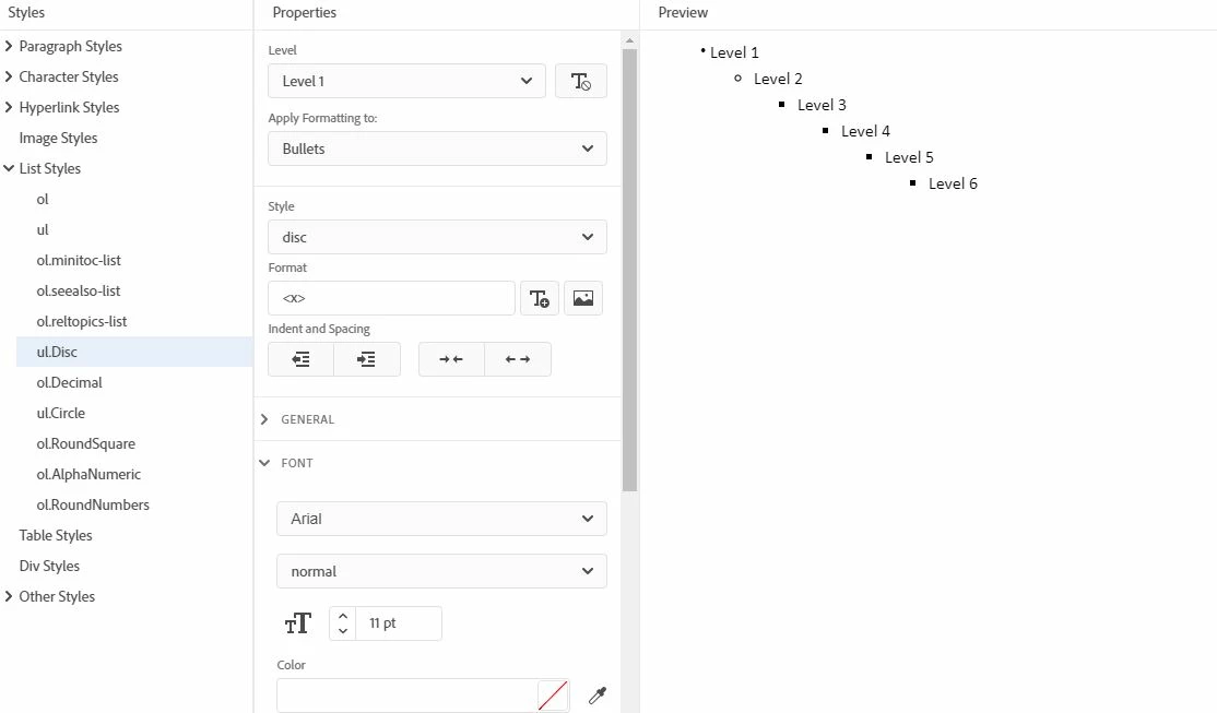 I am trying to match font styles between ul.disc and ol.decimal (see below). I wish to match the font in the numbered list with the bulleted list below. I am also including screen shots for the two different styles. I do not want to change the ol.decimal font. I wish to change the ul.disc style to match the ol.decimal style. When I put in Arial 11 pt. (default font in the project) it did not give me Arial 11 pt. and the bullet got smaller which I do not like.