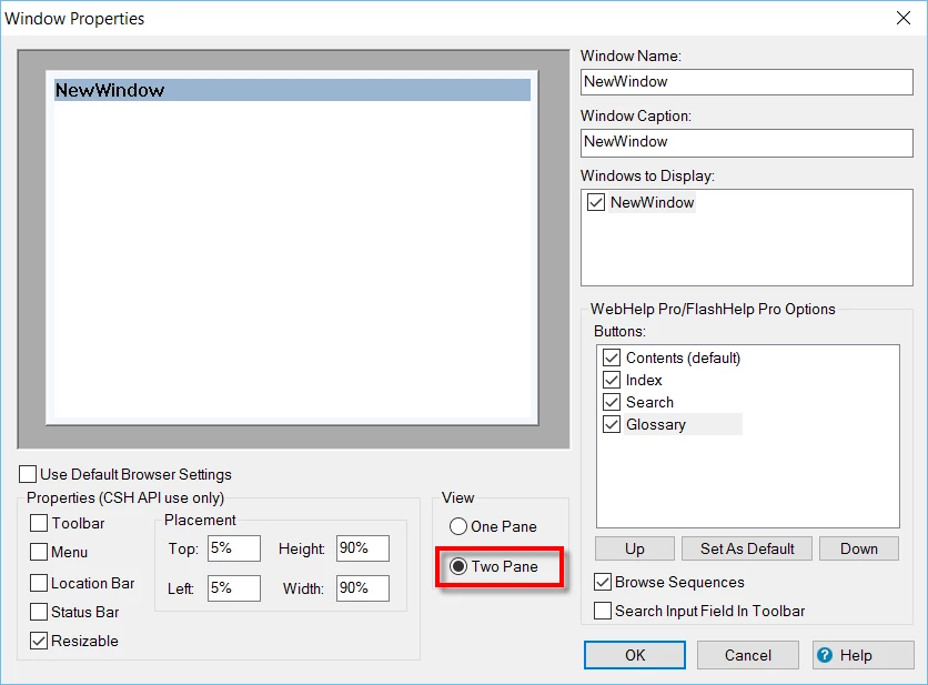 In the cshdat_robohelp.htm file (that is dynamically created by RoboHelp and contains all the topic-to-help file mappings), there is a variable called “gbWithNavPane” that is initialized to false. Is there a setting I can toggle in the RoboHelp application so that the gbWithNavPane variable is set to true?