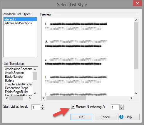 I have created a multilist style, but when using it in RoboHelp 9 (also tested in RoboHelp 11), I am unable to create a new list with that format without the numbering continuing from the previous list. Numbers continue even if I try to change them to 1. When I change it to 1 (which is already selected under the format bullets and numbering), the number disappears and the style is set to normal.