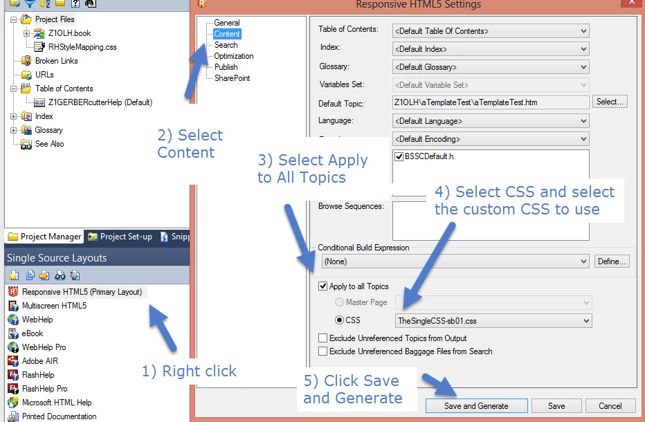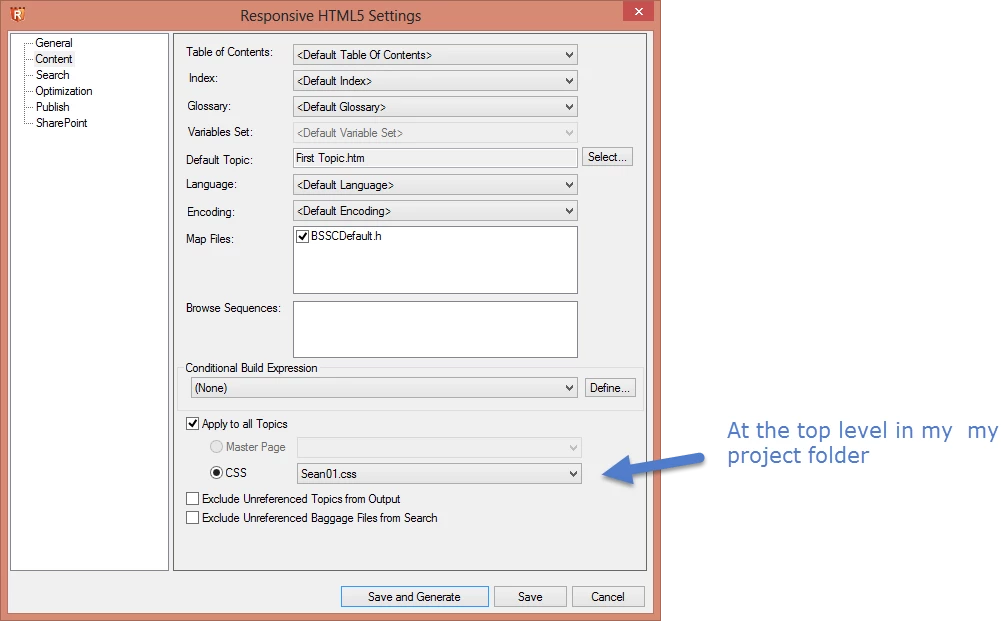 4) Click Content, select the Apply to all Topics check box, select CSS, and choose my CSS, TheSingleCSS-sb01.css.