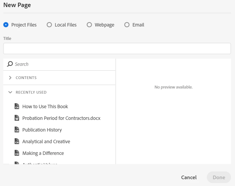 I'm confused about adding a new page to a book in TOC editing view (or Contents view). When I click the "new page" button, the new page dialog opens (see screenshot, below). But the only options are to use an existing project file, a file from my computer ("Local file"), a webpage, or an email.