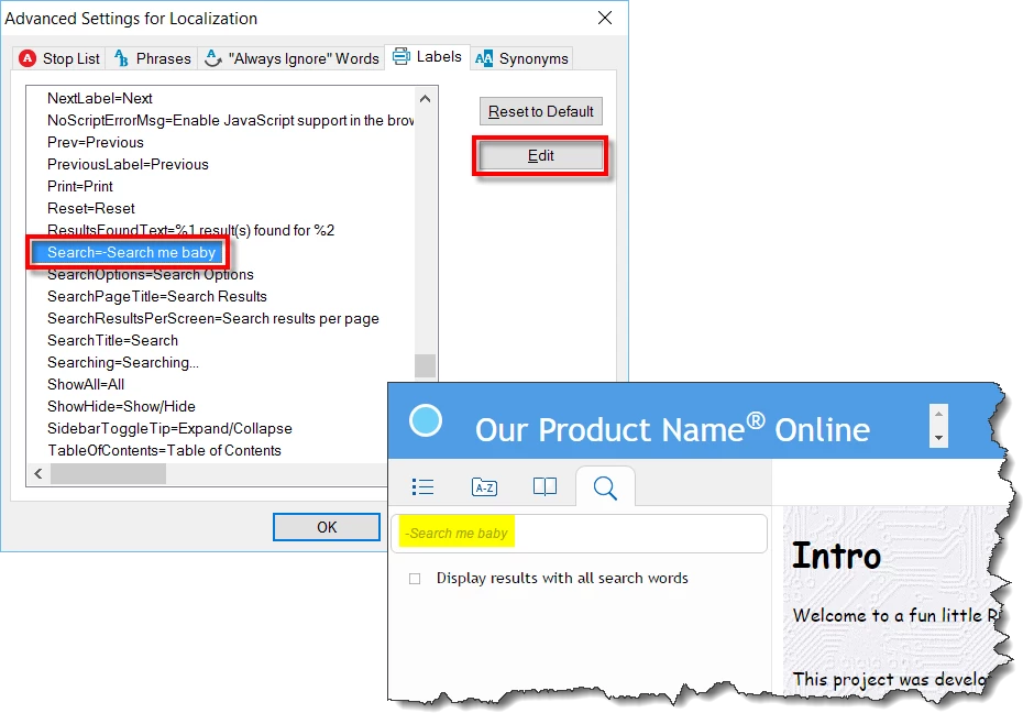 I would like the text that appears by default in my Search box to say "How do I...?" instead of the default "-Search-". I believe this can be done by editing a bit of tagged text in the HTML for the help system's background/frame/whatever, but I don't know where to find that. How would I get to that text to edit it?
