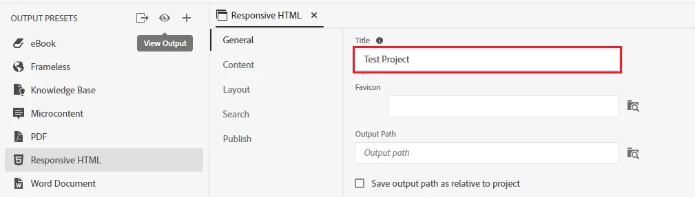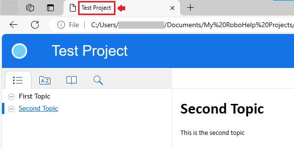 I want to know if we can get the topic name in the HTML page title when we generate output using Responsive HTML preset. For example, I have created a project with title 'Test Project' in RoboHelp.