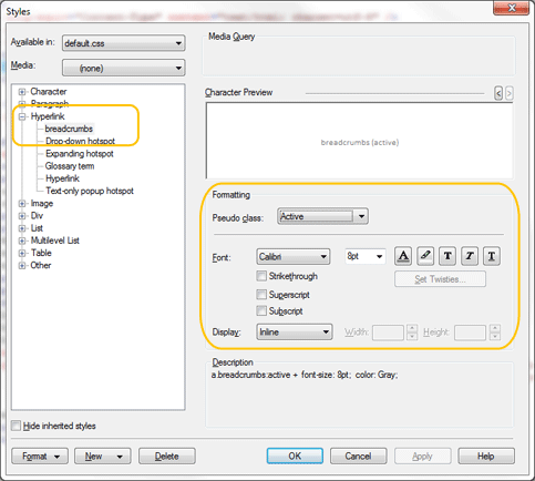 - Click the breadcrumbs placeholder, so it's selected. Then, locate the "breadcrumbs" style in the Style and Formatting pod, right-click it, and select Edit. Define the style you want for your breadcrumbs. I'm not sure if this step was necessary.