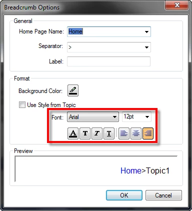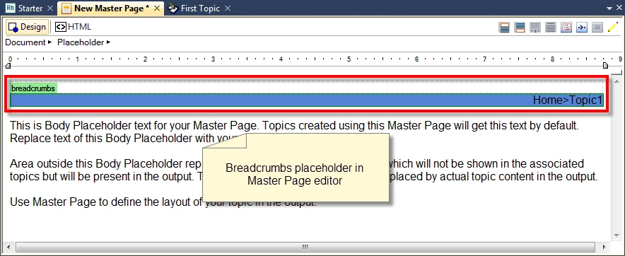 - With the Master Page still open, add a new breadcrumbs placeholder, ensuring that the Use Style from Topic check box is ticked. Ignore all other settings.