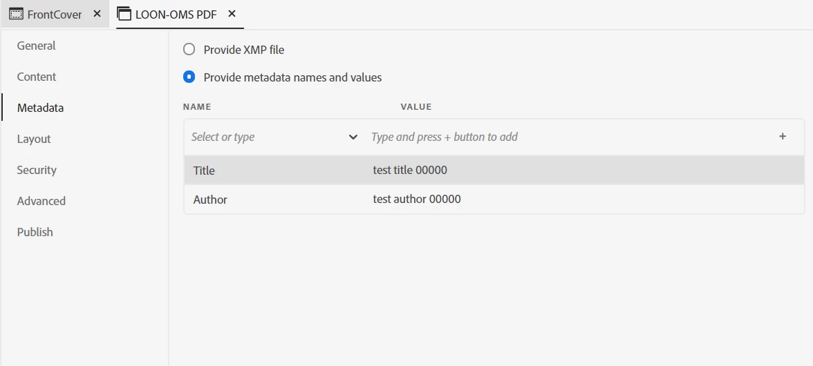In my PDF output preset, I have defined title and author in the Metadata section:
