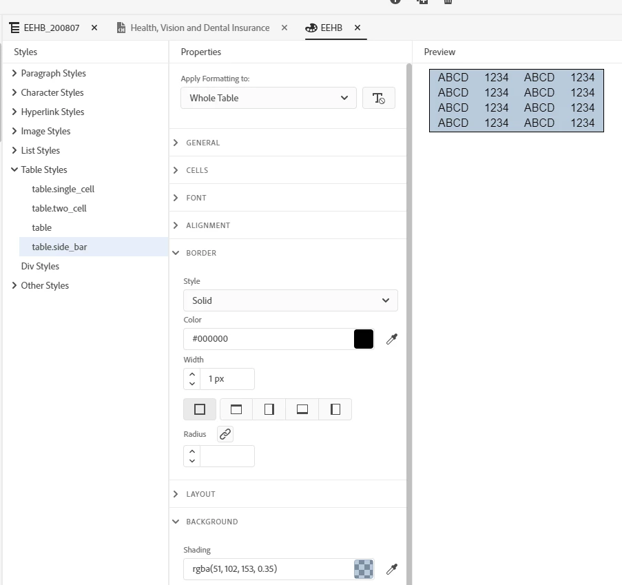 - At the top of the Properties you will see that all the above settings have been applied to Whole Table.
