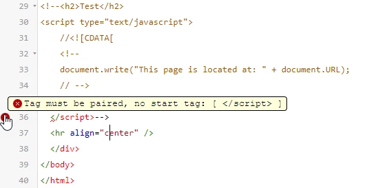 I decide to hide the lines that start with < h2 > through the ending < / script > tag because I may want it for future reference but I don't want to include that section "now" so I add the <!—and --> code before the < h2 > and after the < / script > tag. When I do that, the HTML editor claims I have to have a start tag for the < / script > tag, saying that the tag must be paired: