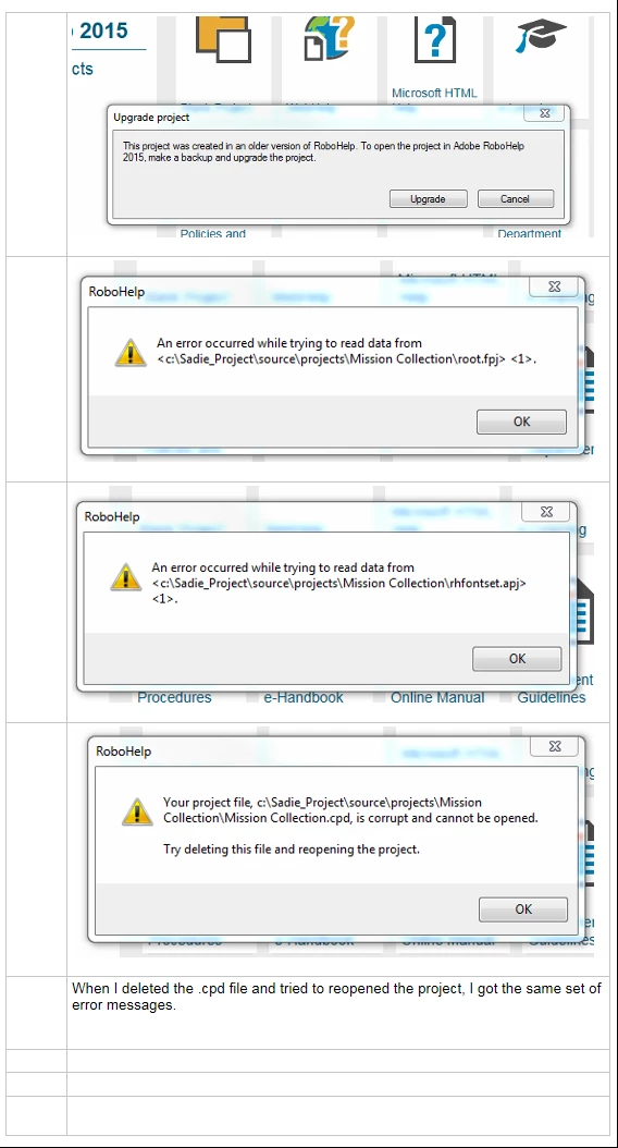 I am having a problem with some of my child files opening in Robohelp 2015 from Robohelp 10. Publishinng to WebHelp. Using a local drive. May I get some assistance in recovering my project? This is the dialog I get when trying to open it.