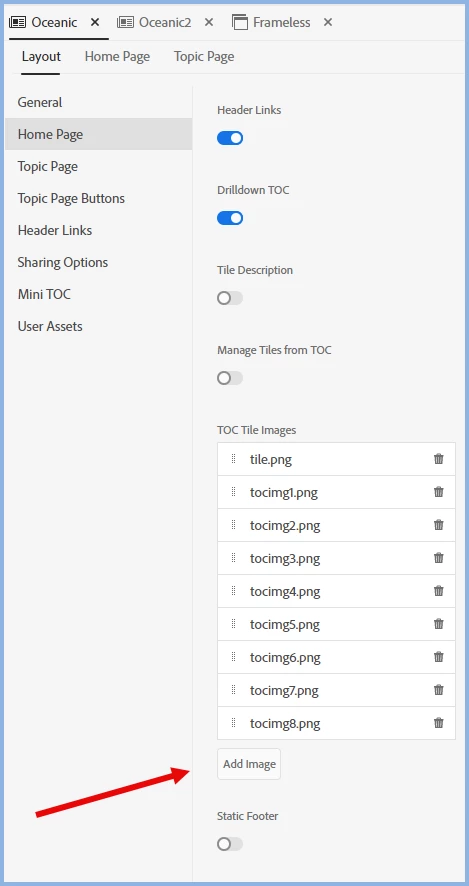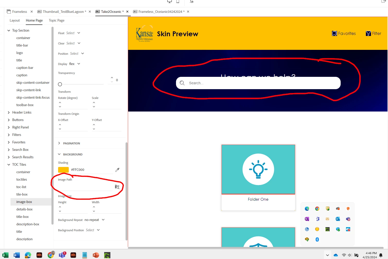 Robohelp 2022 - I need to delete the tile images so we can replace with a different image or at the very leaset, just set a background color for the tiles to get an idea of what we want to do, but I have deleted the tile images for both Blue Lagoon and Oceanic frameless templates, and nothing changes. They stay exactly same as they were before I deleted the picture. To do this I'm going to the Oceanic Template editor and I click on Home Page/TOC Tiles/Image Box and remove toc_default_tile.svg from Image Path. When I do that, nothing happens. When that didn't work, I tried to add a background color (gold) but still nothing happened.