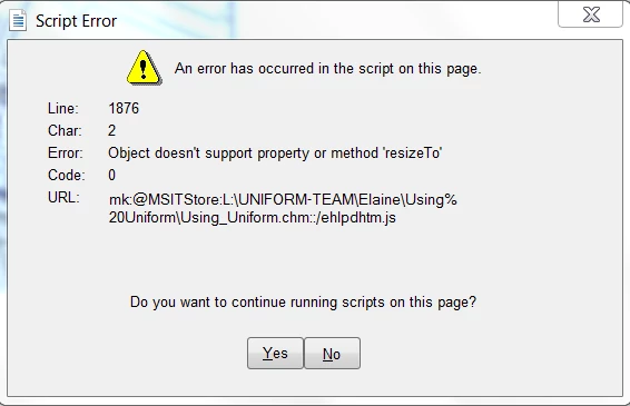I have created an Image Map which includes hyperlinks to display in frame and also in auto-sizing popups. These links work correctly if the topic is opened from the table of contents but if the topic is opened from a link within another topic the image map links don't work: when the display in frame link is clicked no message is displayed and the topic closes; when the popup link is clicked the following Script Error is displayed: