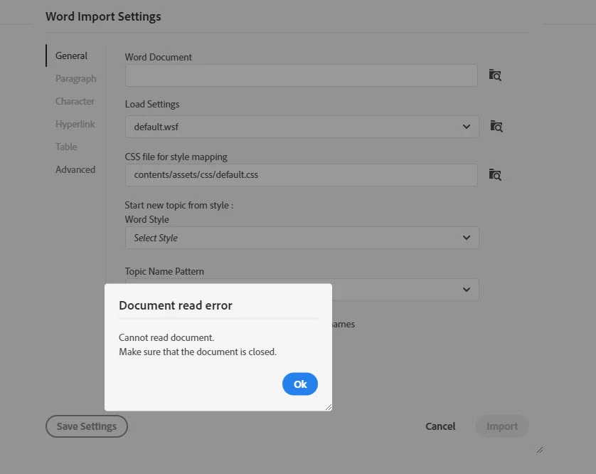 I am using Rh Version 2020.3.0 (2020.3.32) and I have had success importing 5 different Word documents (.docx) files using File > Import > Word Document. When importing my 6th .docx file, I encountered an error with the wording "Document read error; Canno read document. Make sure that the document is closed." (see attachment). I tried a different Word Document (my 7th file) and it imported correctly.
