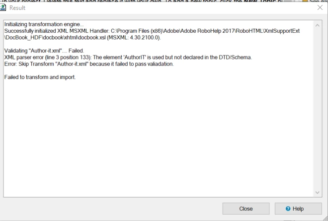 I tried to import this XML file to RoboHelp using the importing tool in RoboHelp, but it failed. Below you can find the dialog box that shows the failure.