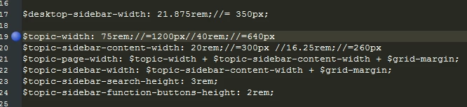C. Edited the topic-width value in the layout.scss file Line 19 to 75rem;//=1200px as recommended here: RH2017 - increase Indigo content pane width Screenshot of the change here: