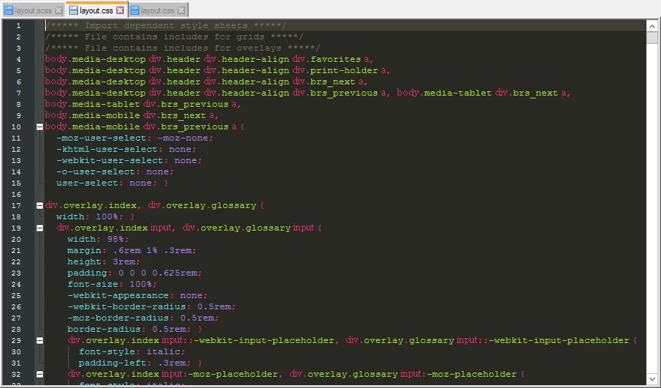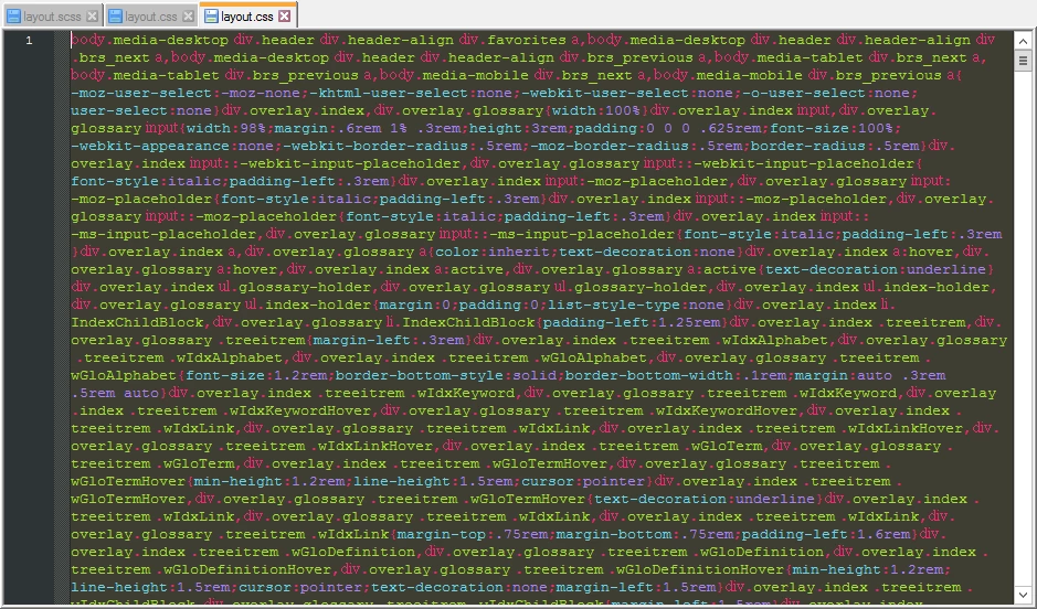 E. According to the instructions linked in 2. above I then copied the layout.css file to a fresh downloaded copy of the Indigo layout. Replaced the original layout.css with the one I compiled from the Koala app. What bothers me here is that the original CSS file looks completely different to the new one that's been created by Koala. See here: