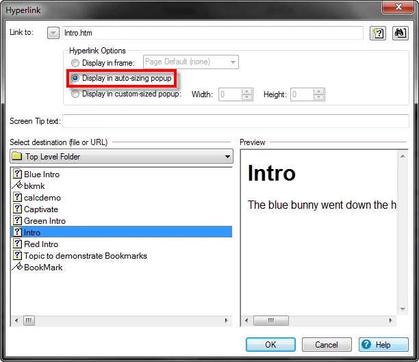 In RoboHelp 2015, how do you create a hyperlinked pop-up window that appears within a topic (that is, the pop-up window appears when the hyperlink is clicked)? I have a screen that appears when a button is clicked and want to show that screen in the same topic.