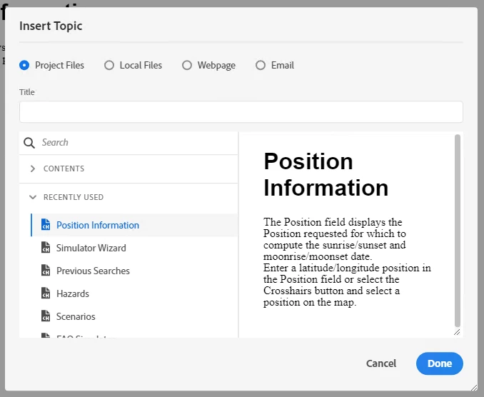 I'm clicking the + button at the top of Table of Contents section. This is the window that displays and then the topic it displayed in the TOC.