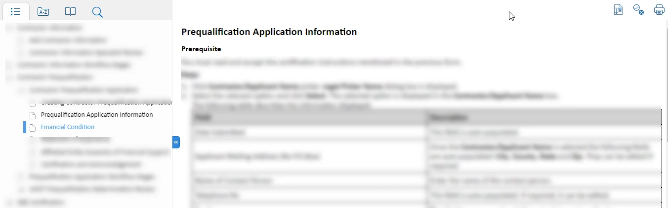 I am sharing a screenshot for reference. Please notice that "Prequalification..." topic content is displayed on the right but "Financial Condition" topic is highlighted on the left navigation pane.