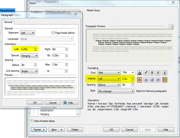 For example, for a bullet style to indent 0.25 inches, I have to set the left indent for the style to 0.5in. If I then click the Format button on the Styles dialog box and select Paragraph, the paragraph formatting dialog box shows the indent for the bullet paragraph to be 0.25in (see image). When I apply the bullet style to a paragraph, it uses the 0.25in indent shown in the paragraph formatting, not the 0.5inches that is set for the indent in the style's properties.